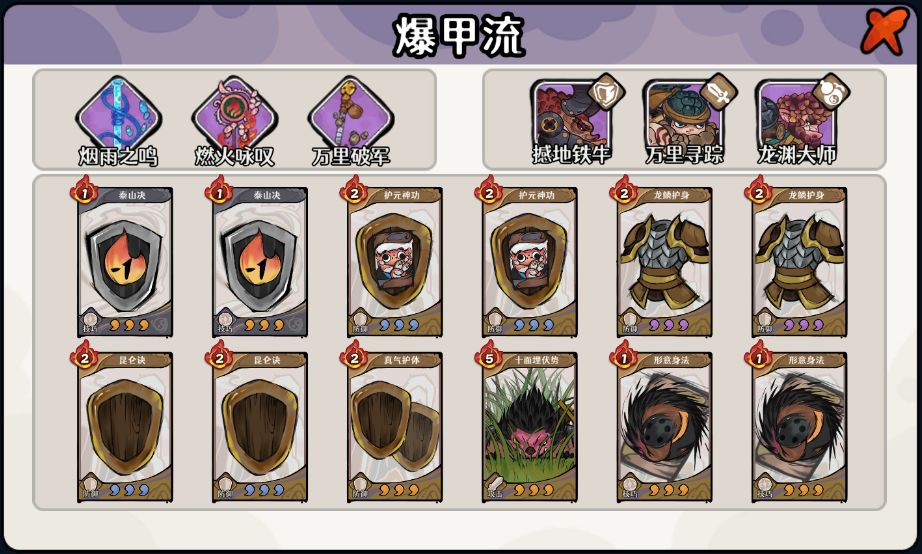 「撼地铁牛」的真气技和神兵被动十分契合「行动流」,但「爆甲流」需要加护甲,所以也能使用。特别是专属卡牌「铁壁之盾」,是很好的低怒气加护甲手段。