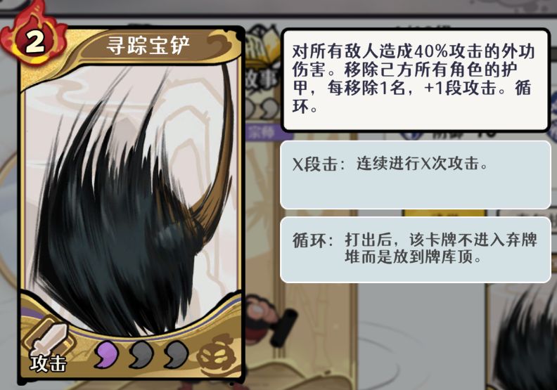 核心是「万里寻踪」的专属卡牌「寻踪宝铲」,每爆掉一个己方角色的护甲就群体攻击一次。