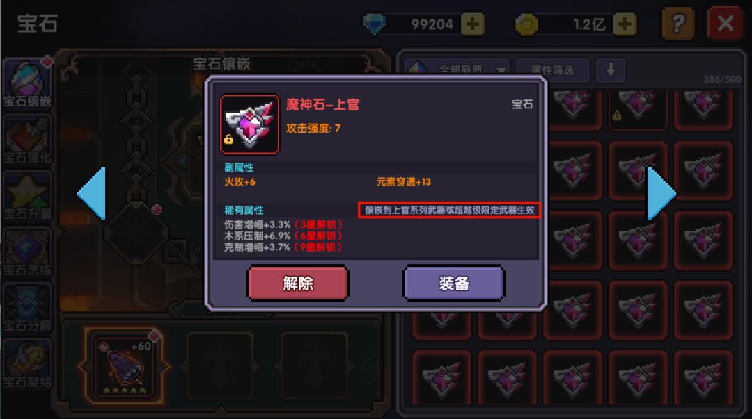 需要注意的是,魔女武器只能放当前流派的魔神石(如上图),放其他的不生效