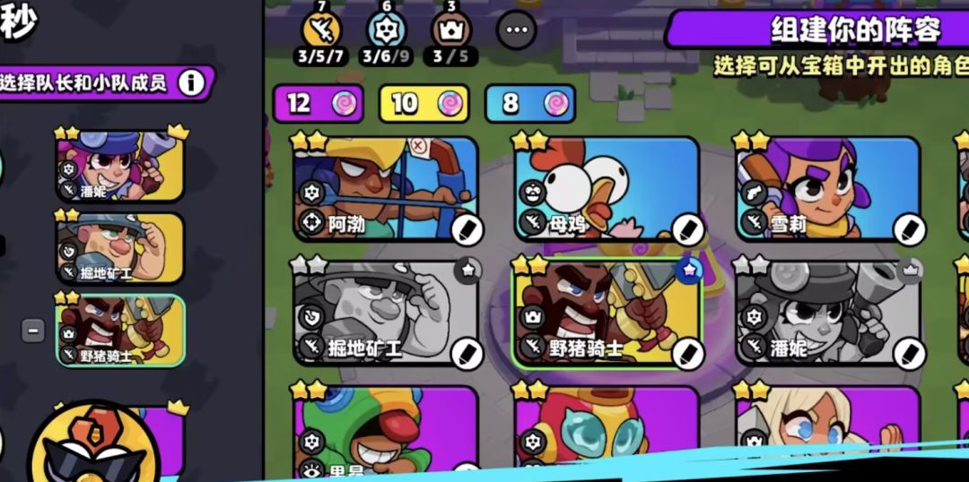 首先我们的队长选择潘妮,其他两位队员选择野猪骑士和掘地矿工。