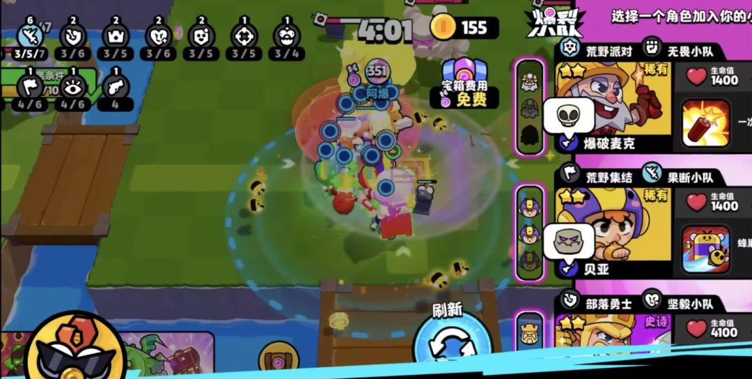 但是各位队长注意啦,赏金模式中的野怪伤害会更高,因此续航也是很重要的一点,因此我们可以开箱找阿渤或者爆破麦克,凑出荒野派对的羁绊。有了这个回血效果,我们就不用担心残血被人偷袭啦。