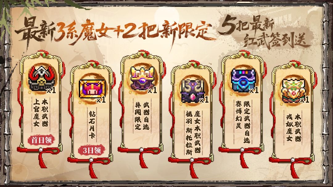 福利一:处于周年庆版本并且版本更新,增加新系统,送的福利多,根据签到时间送对应的福利,可以领取到目前最新三系魔女所对应的武器,还有最新出的限定武器,加快赶上进度