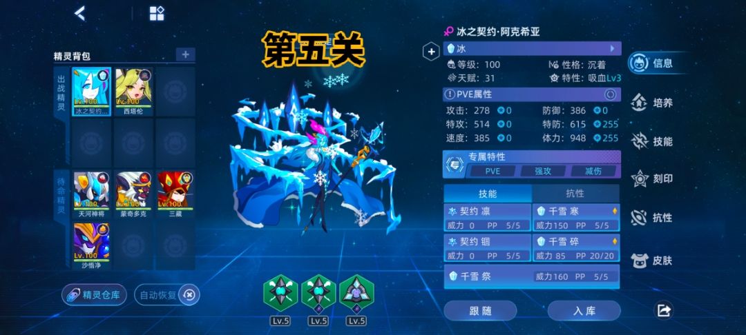 第五关金火双减珠冰之契约阿克西亚以及一个死亡消强化精灵。阿克西亚需求吸血特性三孔特防体力特攻刻印150绑威力宝石,战队属性拉特攻体力特防。操作流程阿克西亚首发主打150,boss强化先三消强,无pp补pp。第二条命切死亡消强精灵送死,切回阿克西亚重复以上流程即可。有低概率第二命150miss翻车,多试几次即可。