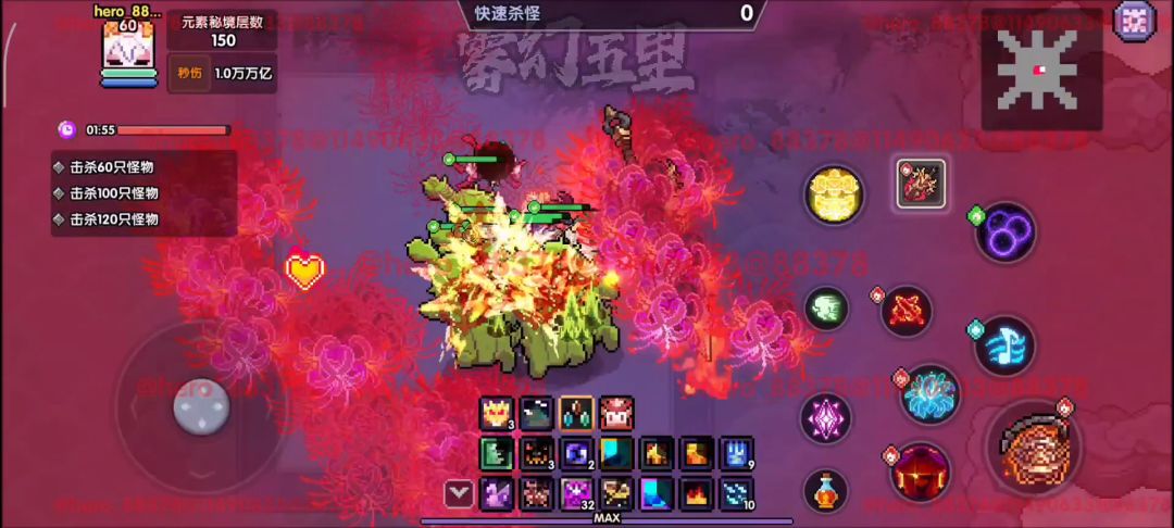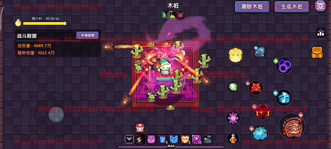 3、对群表现,这次bd是偏对群的,武器、符文方面都是偏对群向的,实战表现也是很不错的,而密集型图会更能打出输出上限,所以对群方面武器选择英魂火显得尤为重要,强行拉怪让对群的花爆可以爆到所有怪物。