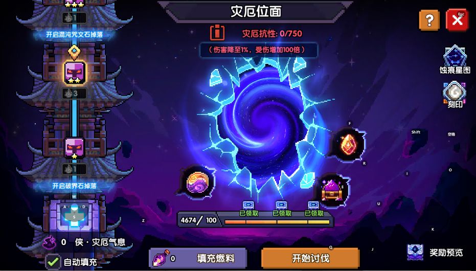 攒够100个侠·灾厄燃料就可以进入一次灾厄位面来获取奖励,可以通过咒文系统来提升自己的灾厄抗性达到更好刷本的目的(灾厄抗性类似于星海远征的抗魔值)