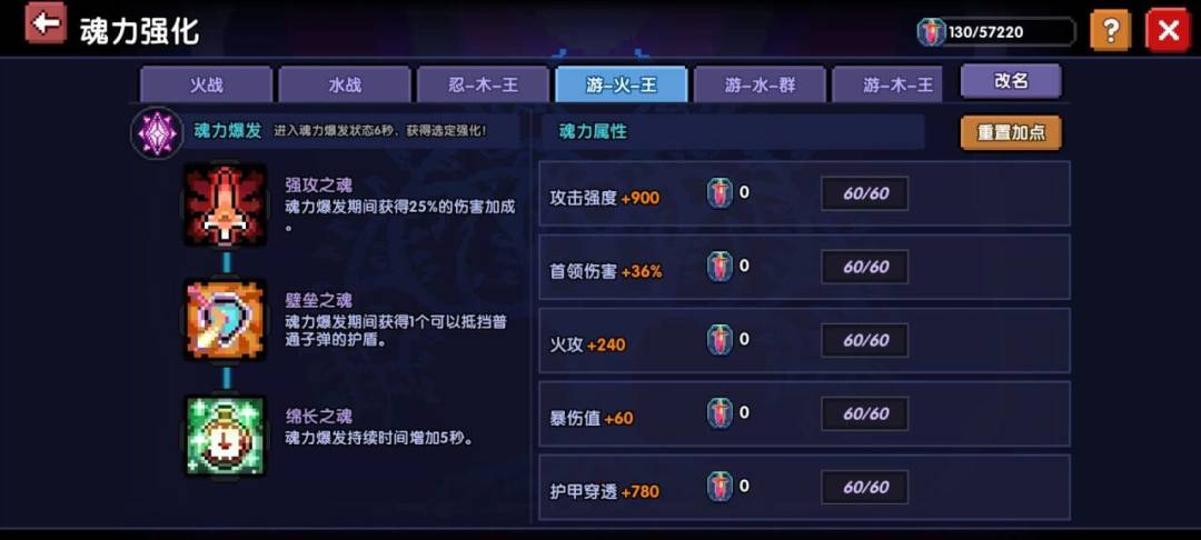 [魂力属性]优先点满护甲穿透、暴击值、首领伤害,然后火攻、爆伤1:1点,随后攻强(上面的攻击强度)、无限攻强(下面的攻击强度)8:3分开点