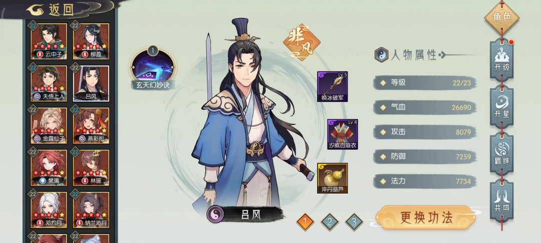 第二回合:天悟上人打出三清化水符和五行化水咒,云中子打出百转叠浪诀和三清化水符,天悟上人打出断水龙威,柳盈打出玄冰神破、玄冰九变和化刃符,吕风复制玄冰九变并打出,接着击杀大怪和三只小怪循环,直到我们不能一次性击杀三只小怪的时候停手。