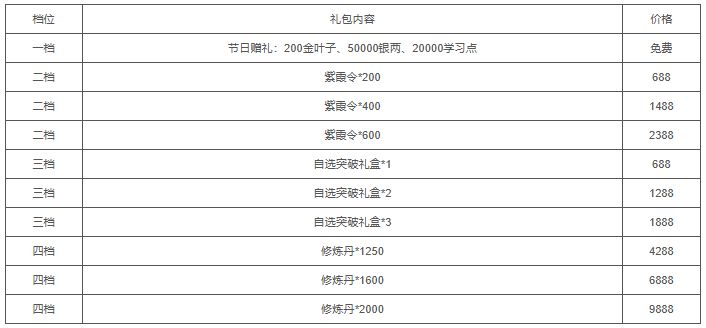 活动一:活动期间将限时上架节日礼包,礼包内容如下: