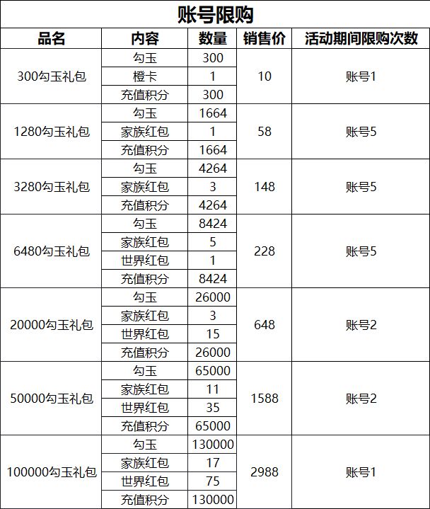 4. 礼包购买超过次数将不额外附赠勾玉,仅根据当前游戏内该档位勾玉数量进行发放;道具礼包超过购买限购次数将发放等价勾玉。
