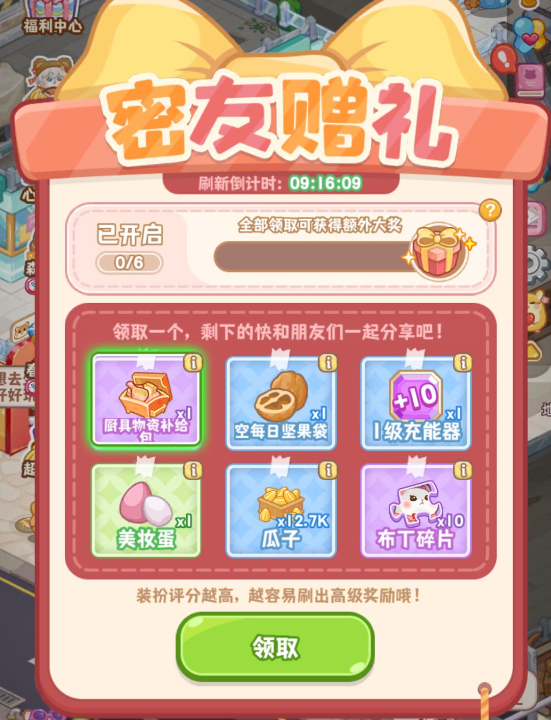 各位店长每日可六选一获得瓜子、钻石等礼物,然后分享给好友,剩下5个奖励领取完成后即可获得豪华招募券*1+山竹的礼物*1