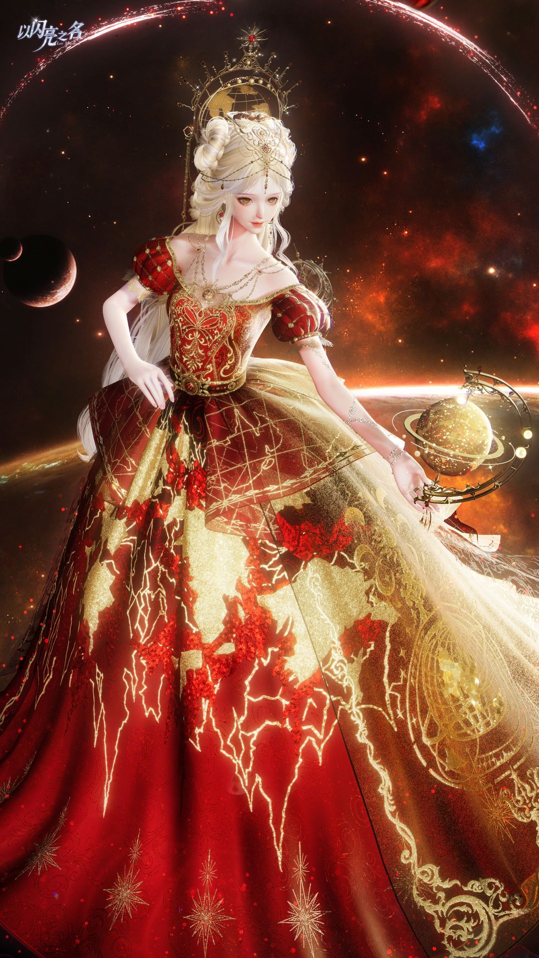 为呈现宇宙的璀璨质感,裙身缀满亮片与珠宝,无数光点随角色动作在裙摆间流动,模拟星系光芒的闪烁变幻。手持星球仪通过独立骨骼动画系统实现流畅自转,还原天体运行的优雅轨迹,同时基于Shader技术的动态流光沿星球仪纹路规律性流淌,随转动角度呈现光影强弱变化,赋予装置能量流转的生命力。裙摆通过体积光与动态效果构建流动星尘,静立时如散落星光,行动时则汇聚成绚烂星河,让穿戴者仿佛将整个宇宙穿于身上,在优雅与科幻的碰撞中,演绎星际间的浪漫咏叹。