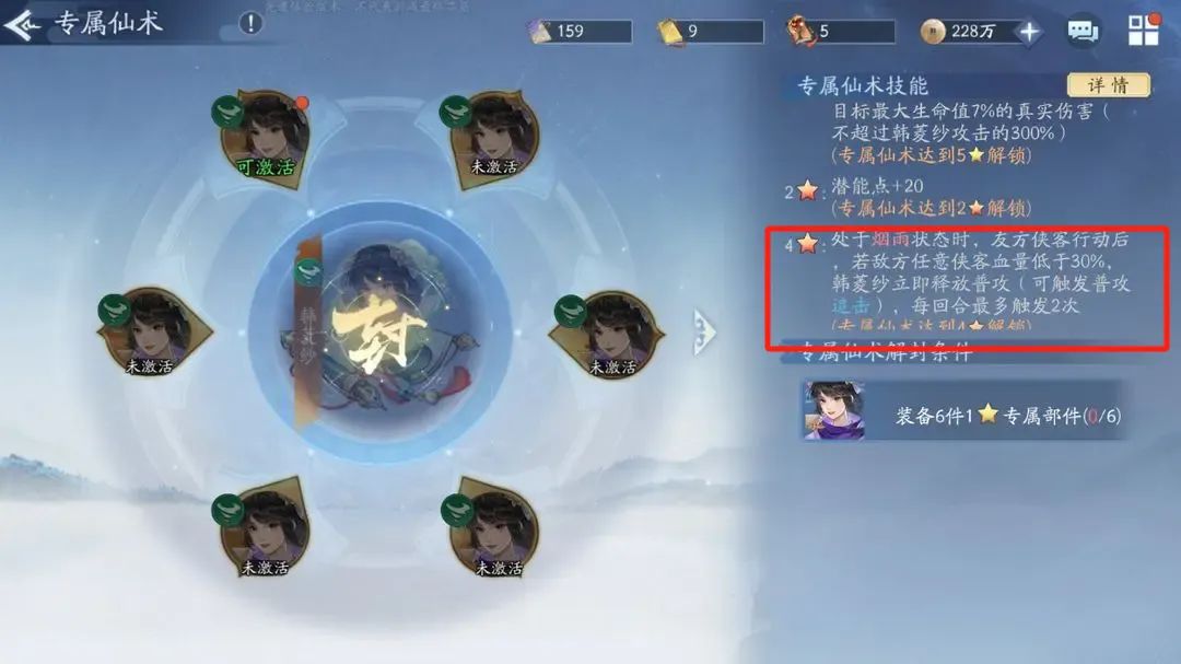 原版:处于烟雨状态时,友方侠客行动后,若敌方任意侠客血量低于30%,韩菱纱立即释放普攻(可触发普攻追击),每回合最多触发2次