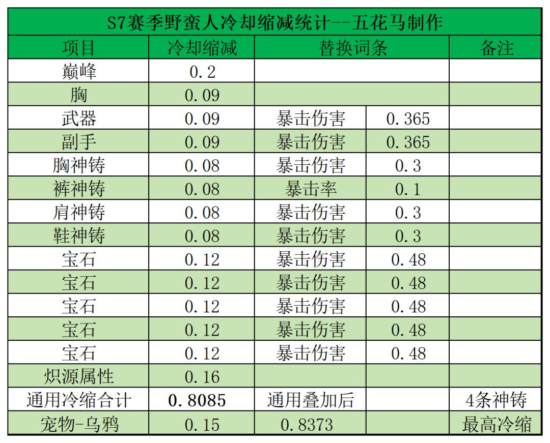 为了达成特定流派技能循环,如果冷缩要求高于0.3885时,需要额外调配其它装备词条、宝石和宠物等达成。常见的有:装备主副手有0.09冷缩,神铸之语0.08,宝石0.12,宠物乌鸦0.15。