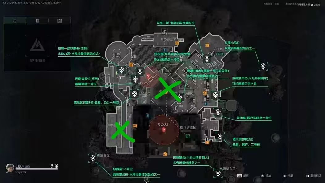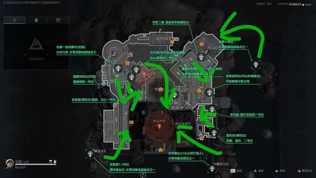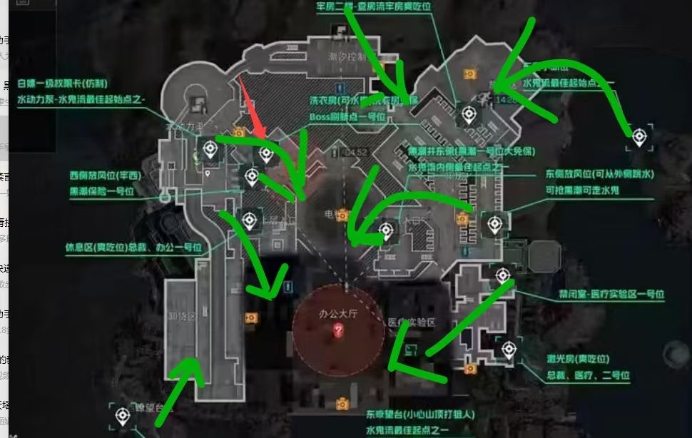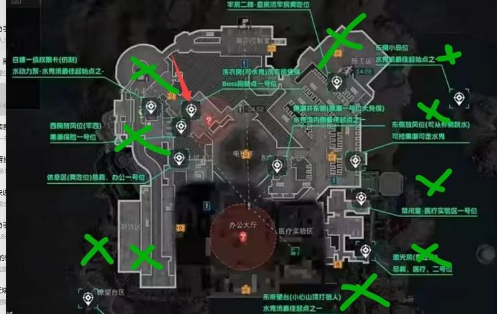 图九、十:监狱大致就是这样,反正最终肯定是会围绕办公大厅打,医疗实验区的话会有三队,外海两个阿萨拉,核心区三个。图十这种的话是最常见的,也是最难打的,都不打架,直奔办公大厅,这种的话最难打,不亏个60万子弹钱是走不掉的