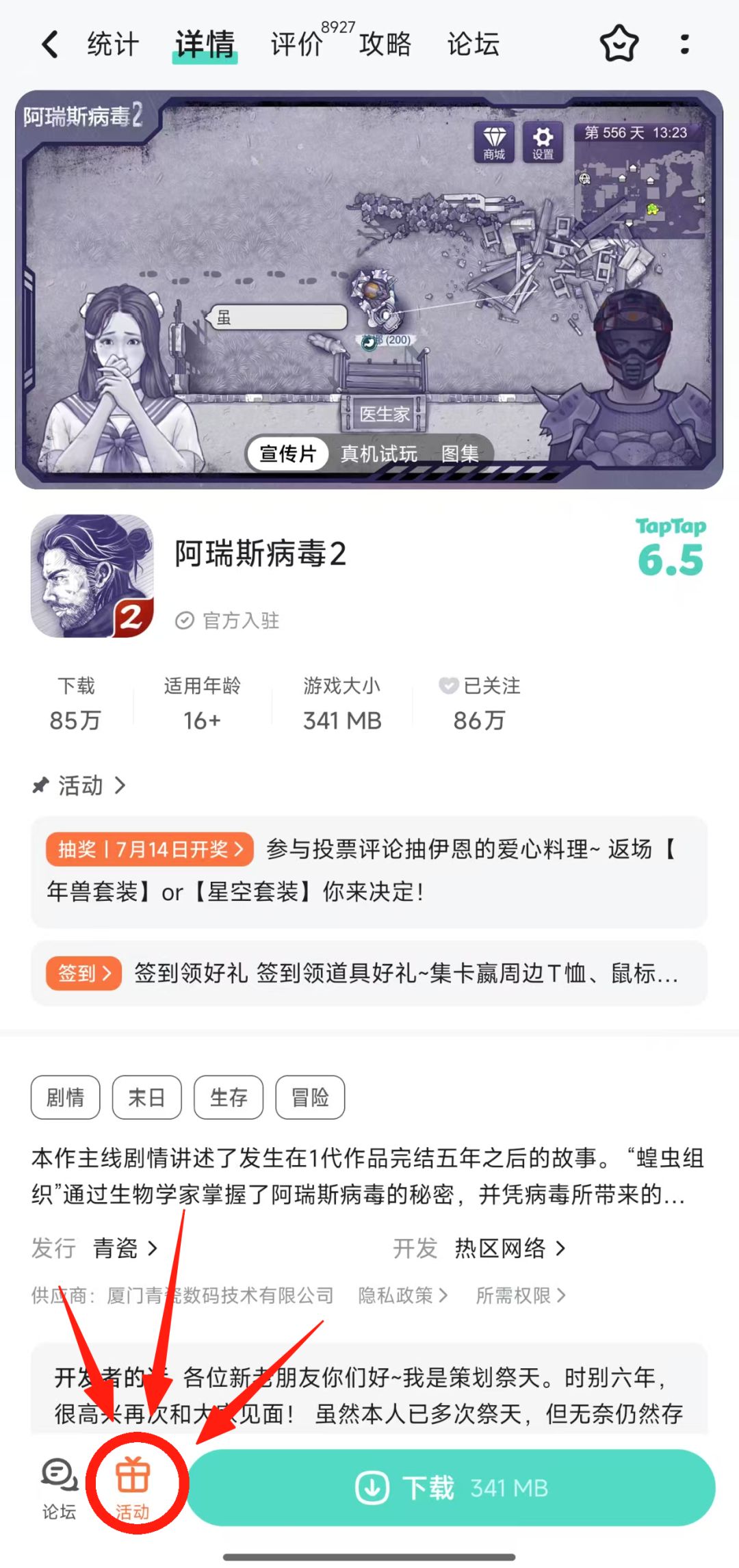 :活动期间前往TapTap《阿瑞斯病毒2》游戏详情页左下角点击活动参与领取。