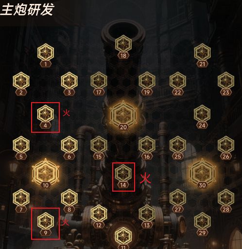 2.主炮研发:因为我们选择的是纯火搭配,检查一下主炮研发第4,9节点是否正确选择火焰相关的属性
