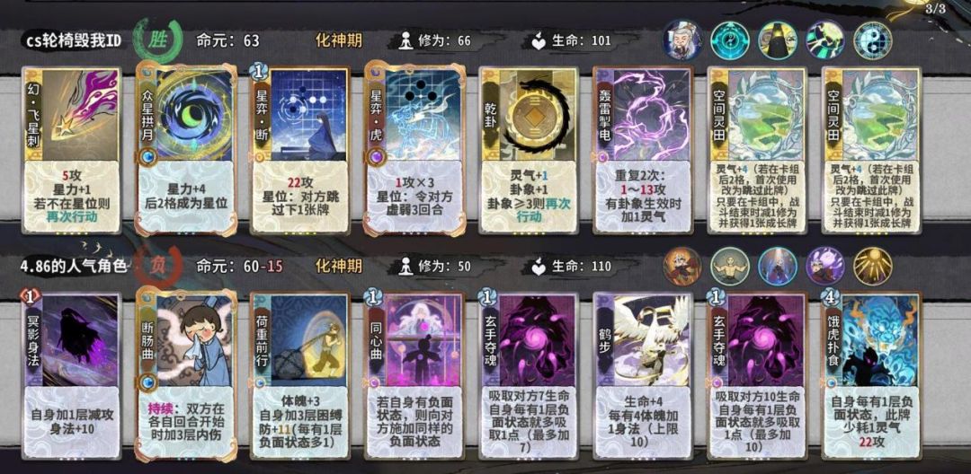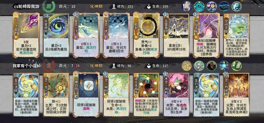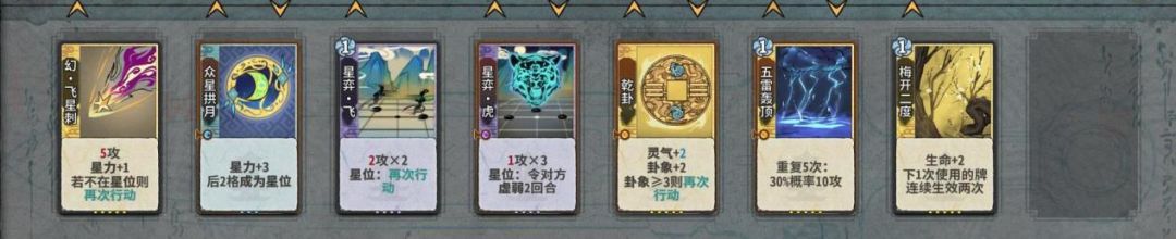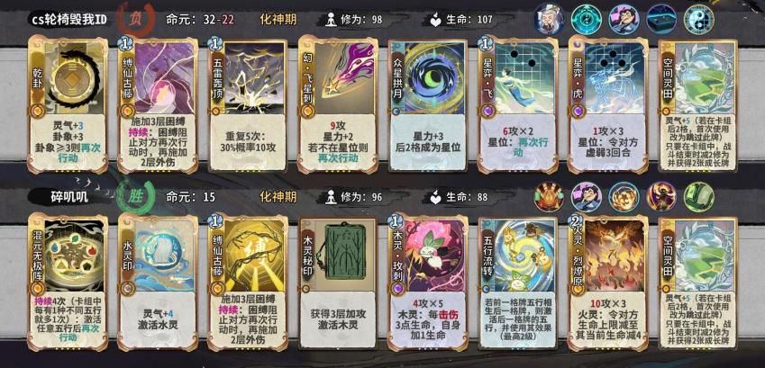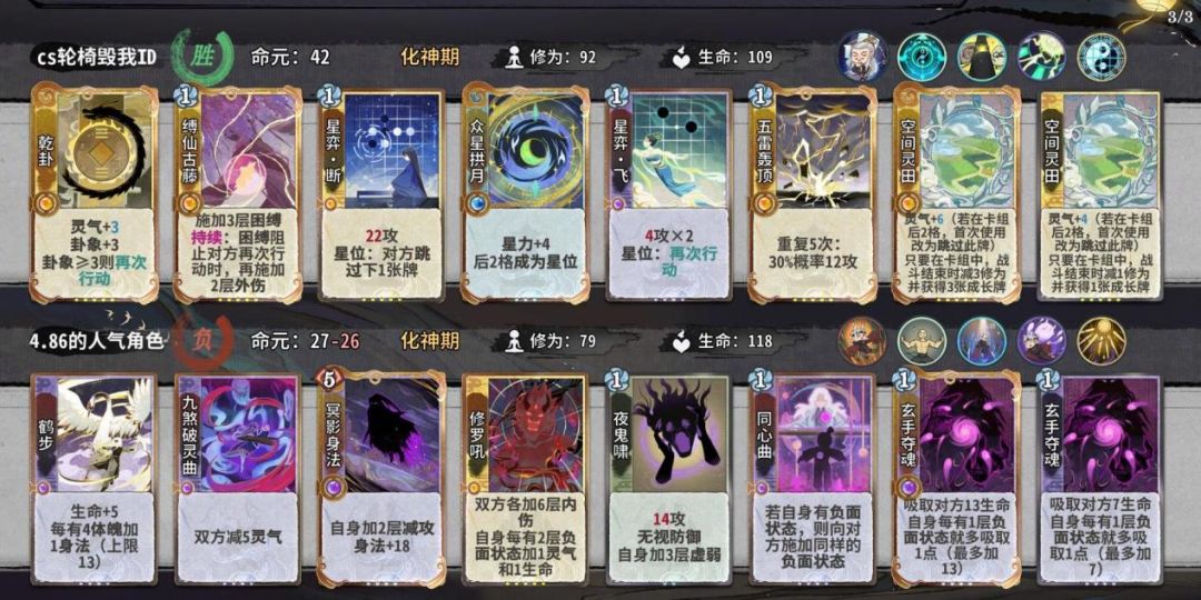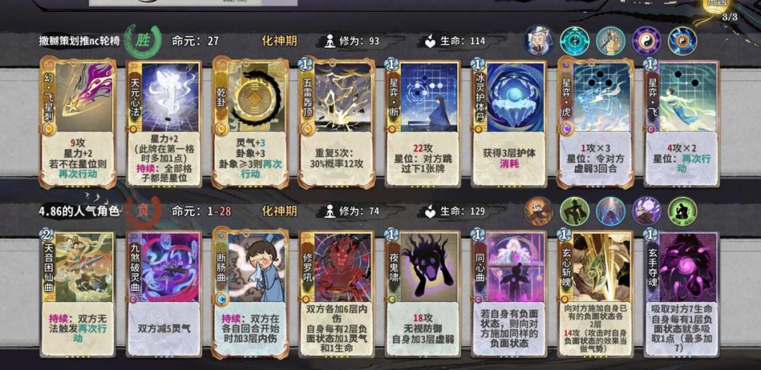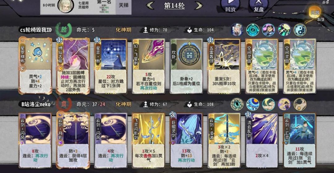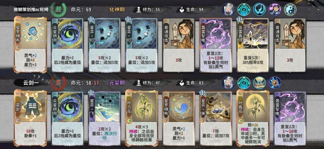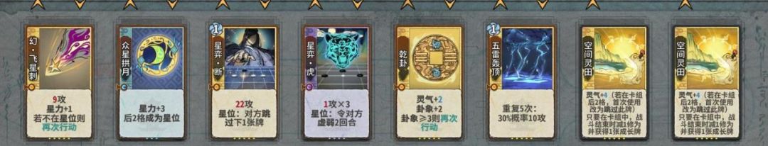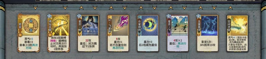 如何以最优的结法打最高的伤害,在这个时间段比较好用的有天元,蜻蜓,轰雷,而这阶段我们要进行牌堆的优化,牌堆除化神牌6张,修为丹和悟道丹4张以外都是8张,所以我们在这几轮要开始压缩牌库,练气牌尽量吃掉而不是d掉,化神牌除乾和五雷和断以外,吃1d1梅开可以留1张在手里,但如果卡手不能强留,d牌一个小思路,优先d掉你所需要牌境界的牌以来增打d到的概率。如果你所选的是田,在乾卦没有满级时,你手里要留一张至少+2蓝的牌,来打出藤断做为应对。