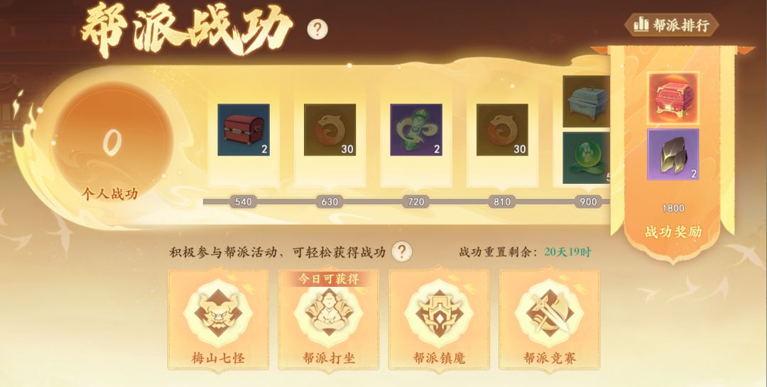 (4)帮派战功排名在重置时结算,战功不为0的成员可根据帮派名次获得奖励。