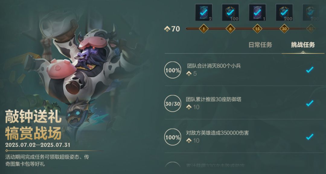 截止至7月31日,召唤师完成活动任务就能领取“哞利斯塔 阿利斯塔”超级姿态-两军交战 不斩乐师、传奇图集五星卡包(金)、传奇图集四星卡包(紫)等好礼,还有集萃晶石可以拿!
