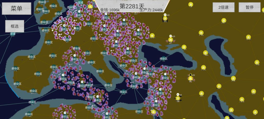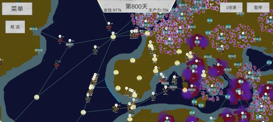 顺利的话,打完差不多就500~600天左右。优先构成防线(图三)开始有几波试探,顶住后不用出征,开始屯资源(这是本局游戏唯一的发育时间)屯多久取决于丧尸啥时候打过来
