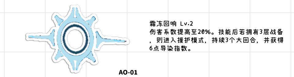●行动结束时获得1点战备(用于主动技能2释放完之后获得指令追加),3点导染(用于主动技能2和制胜技的伤害提高)。伏击后获得1点导染(同上)