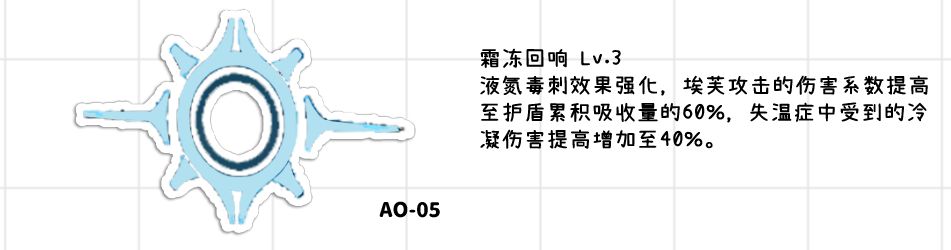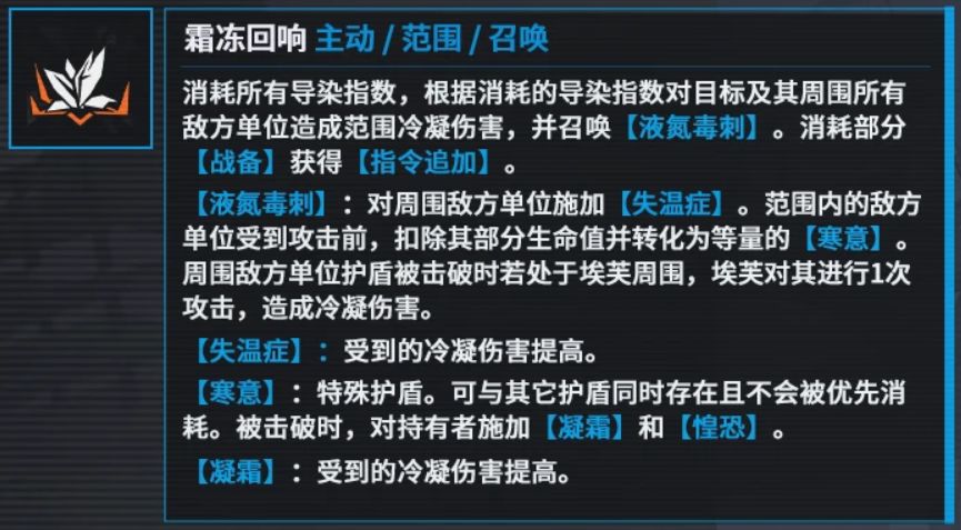 ●召唤液氮毒刺(3个大回合):1、对范围内的敌人施加失温症:受到的冷凝伤害提高。2、受到攻击前若地方没有寒意(就是这个效果转化后的护盾),则扣除埃芙500%攻击的血量转化为寒意(也就是护盾)几个注意的点:A:血量最大扣到1点,但是可以配合洛贝拉的固键做到穿盾击杀,相当于能直接秒杀掉埃芙攻击力(这个攻击力是战斗中的攻击力是可以吃到一堆加成的)500%血量以下(可以再多一点)的小怪。B:每个大回合每个单位寒意最多触发一次:不过如果是套上同心感应的埃芙或者是玛绮朵,可以通过伏击来高频率秒杀敌方血量不足的小怪单位。C:由于洛贝拉的在友方造成伤害后会附加一次伤害,所以使用埃芙主动技能2的时候可以直接做到对范围内所有血量达标的小怪做到集体秒杀。3、如果敌方护盾被击破了,则埃芙还会对其进行一次攻击,伤害为盾吸收量的40%,大部分情况下也就是一次200%攻击力倍率伤害,再加上埃芙自己的伏击,光这两个伤害就能够达到每回合380%倍率的伤害了,这个倍率已经是标准0椎火力倍率了,埃芙主要亏一点面板。