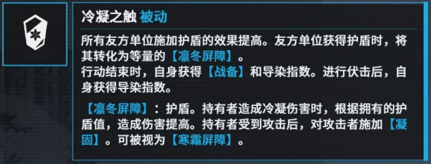 0椎强度非常强的支援人形,以提供护盾、伏击、提供冷凝增伤为主的人形,同时还拥有把敌人血转化为护盾的独特机制。