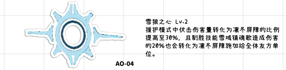 ●友方施加的护盾效果提高,同时会转化为凛冬屏障。凛冬屏障:可视为寒霜屏障(就是老的护盾),上限为埃芙初始攻击力(也就是整备室面板)的200%(满椎300%),每拥有1000点护盾造成伤害提高1.5%(满椎翻倍)。假设埃芙的攻击力为3000,那就是0椎能提供到6000的护盾上限(已经是春田级别甚至略高于春田提供的额外血量了),增伤也就是9%。