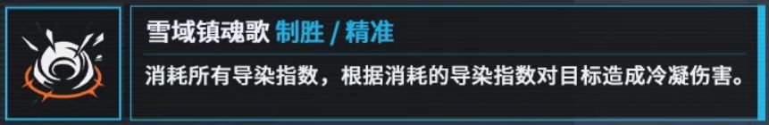 ●单体伤害技能,消耗完所有导染(初始消耗1点),根据消耗的导染数量提升倍率和稳态伤害,常规伏击能够吃满的情况下导染每回合都是满的,正常环境下按满导染计算就行,推图中可能会出现导染没有满的情况。