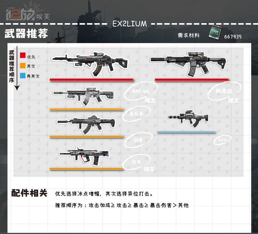●配件选择方面:攻击加成≥攻击≥暴击≥暴击伤害>其他当然如果佩戴暴击固键的话可以适当降低暴击需求从而追求更高的攻击和爆伤。