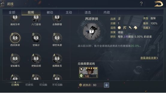 在鸿图之下中武将除了自身主将技和先天自带的一个武技外还能学习两个武技技能,这两个技能可以根据自己的需求自由搭配,可自由学习的武技一共分为五大类:指挥技、主动技、被动技、连击技、内政。其中被动技和指挥技是开局就能释放的,但是有的是需要在特定条件才能释放的,比如西凉铁骑指挥技,他只能使我方骑兵武力伤害提高,当我方没上骑兵时不生效。