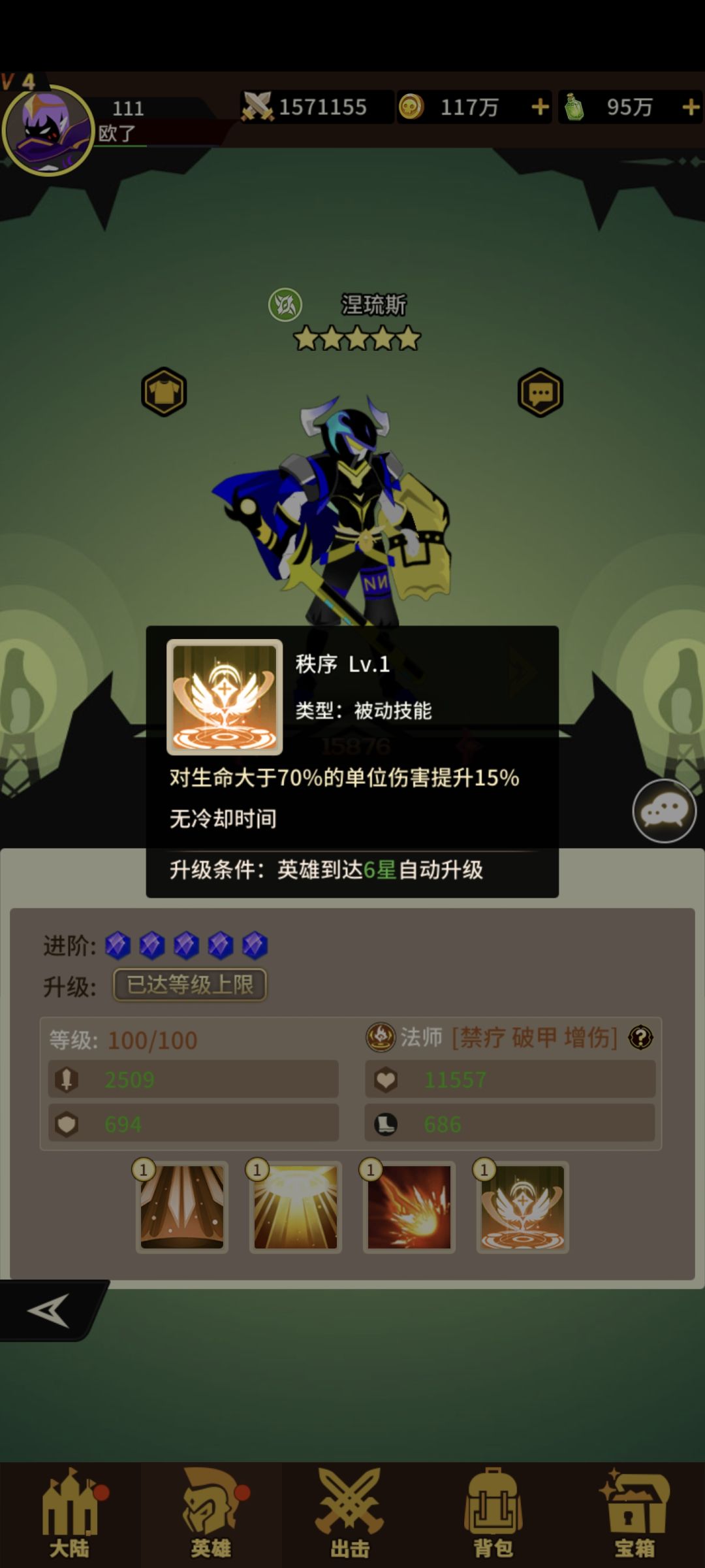风系法师涅琉斯!获取难度一般!四技能!抽卡就出!一技能打单体+概率禁疗二技能+攻击+生命三技能打随机三个速度比自己低增伤30%四技能对生命高于70%增伤!过渡法师狗粮一枚