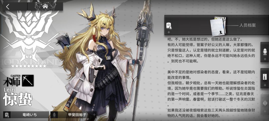③虽然跟左先生一样都是公务员,但是惊蛰来罗德岛是为了给以前的尘封旧案翻案,这件事主要牵扯到煌(详细见25年明日方舟春节剧情)