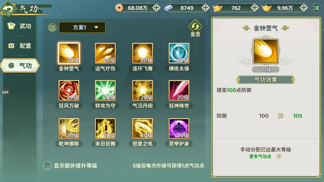 比如点修金钟罡气可以加防御值,点修狂风万破可以延长怒气持续时间