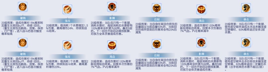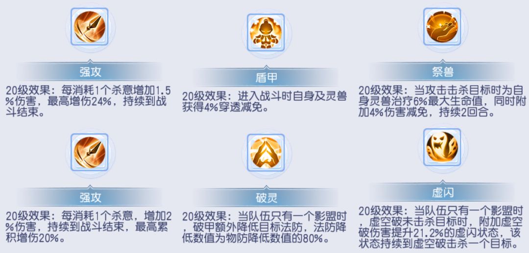 强攻(现):每消耗1个杀意,增伤2%伤害,持续到战斗结束,最高累积增伤20%。盾甲:进入战斗时自身及灵兽获得4%穿透减免。祭兽:当攻击击杀目标时为自身灵兽治疗6%最大生命值,同时附加4%伤害减免,持续2回合。