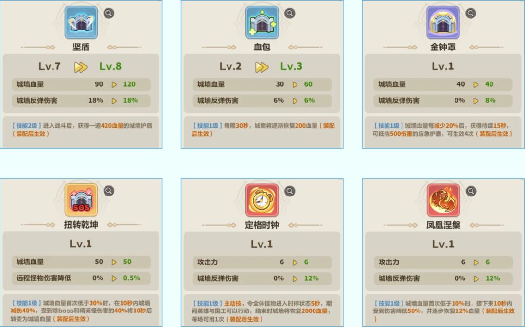 最后是全新系统:城墙机关盘点,在激活机关获得攻击力/城墙血量等基础属性加成的同时,每种机关的效果也各不相同。