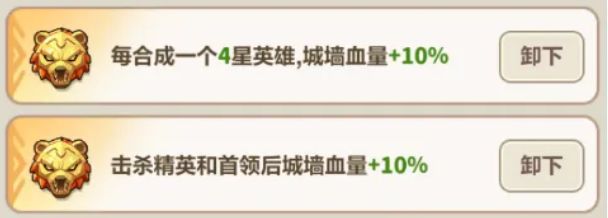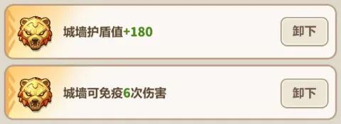 除了通用位置的【城墙护盾、免伤】词条外,皇冠部位的熊王图腾还有2个城墙回血词条,在叠加了城墙血量上限后,该词条的效果会比城墙护盾要强力许多。