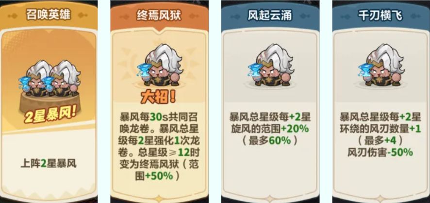 暴风的强化词条优先选【2星召唤】和【终焉风狱】;如果需要进一步扩大范围攻击,选择【风起云涌】;如果想提升输出,选择【千刃横飞】。