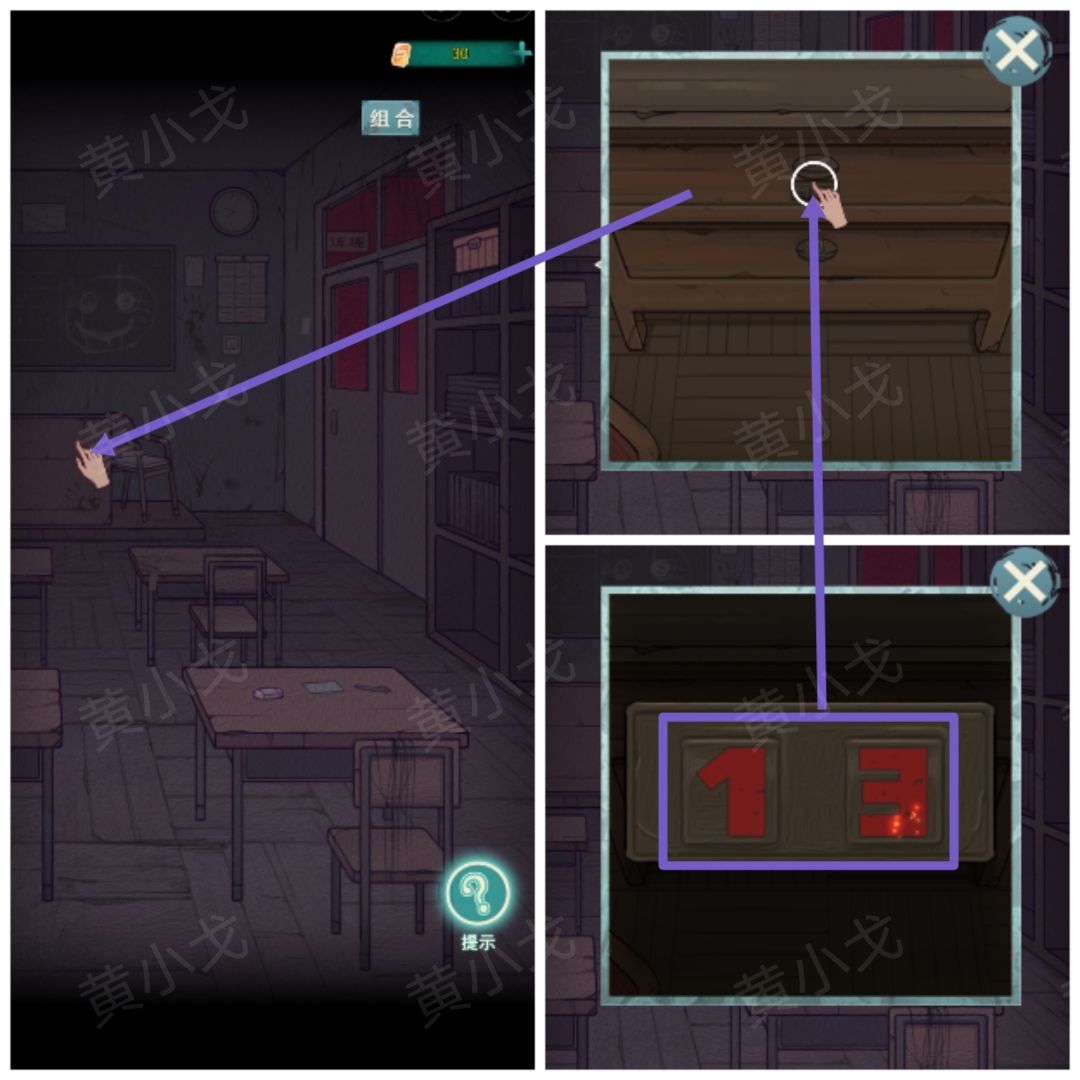 8.点击讲台下层抽屉上的密码锁,根据窗户上的线索,输入密码:4217