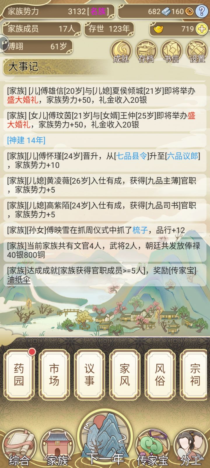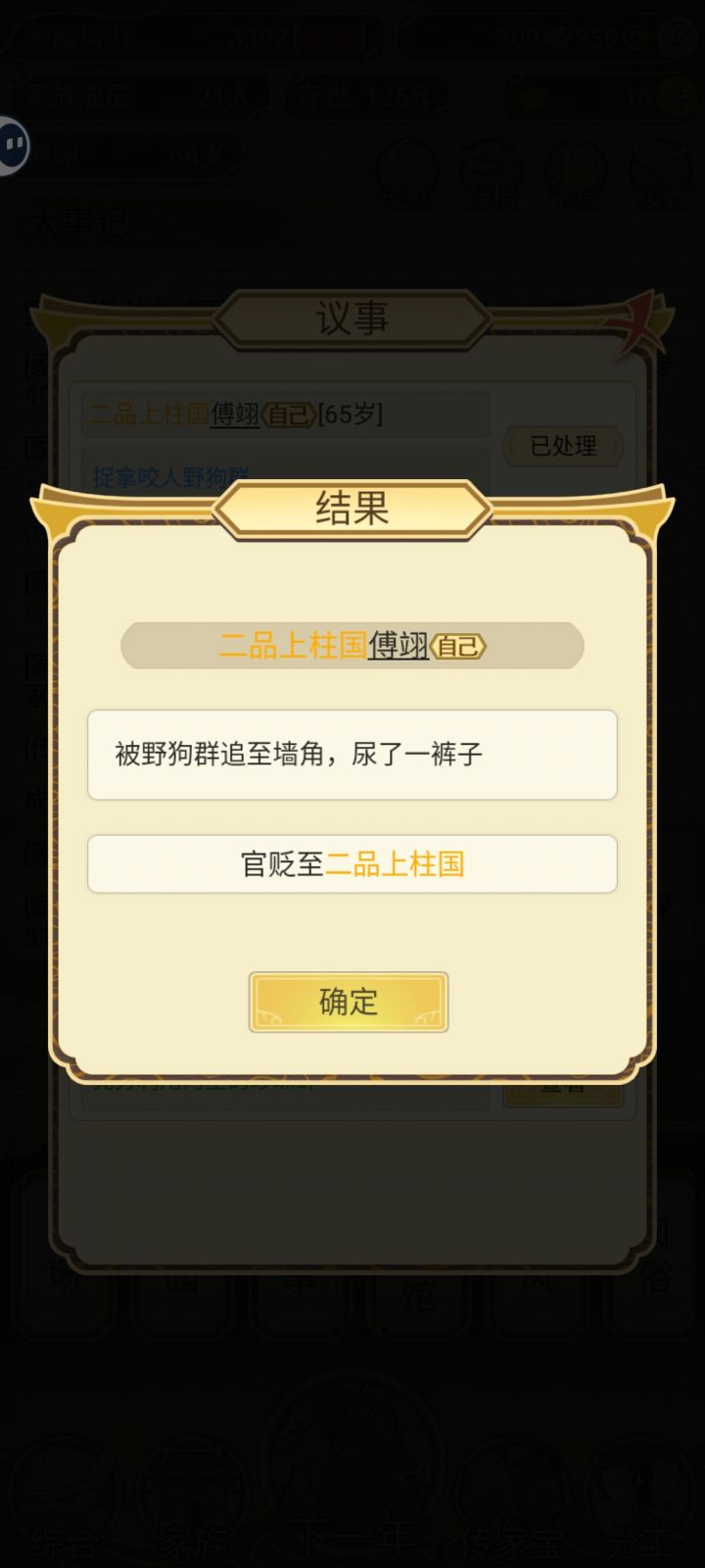 我的家族身居高职的太多,而且还年轻有为,为了家族着想,族长自污被从一品天策将军贬成二品上柱国,这游戏希望以后能更新篡位家族自立为皇族
