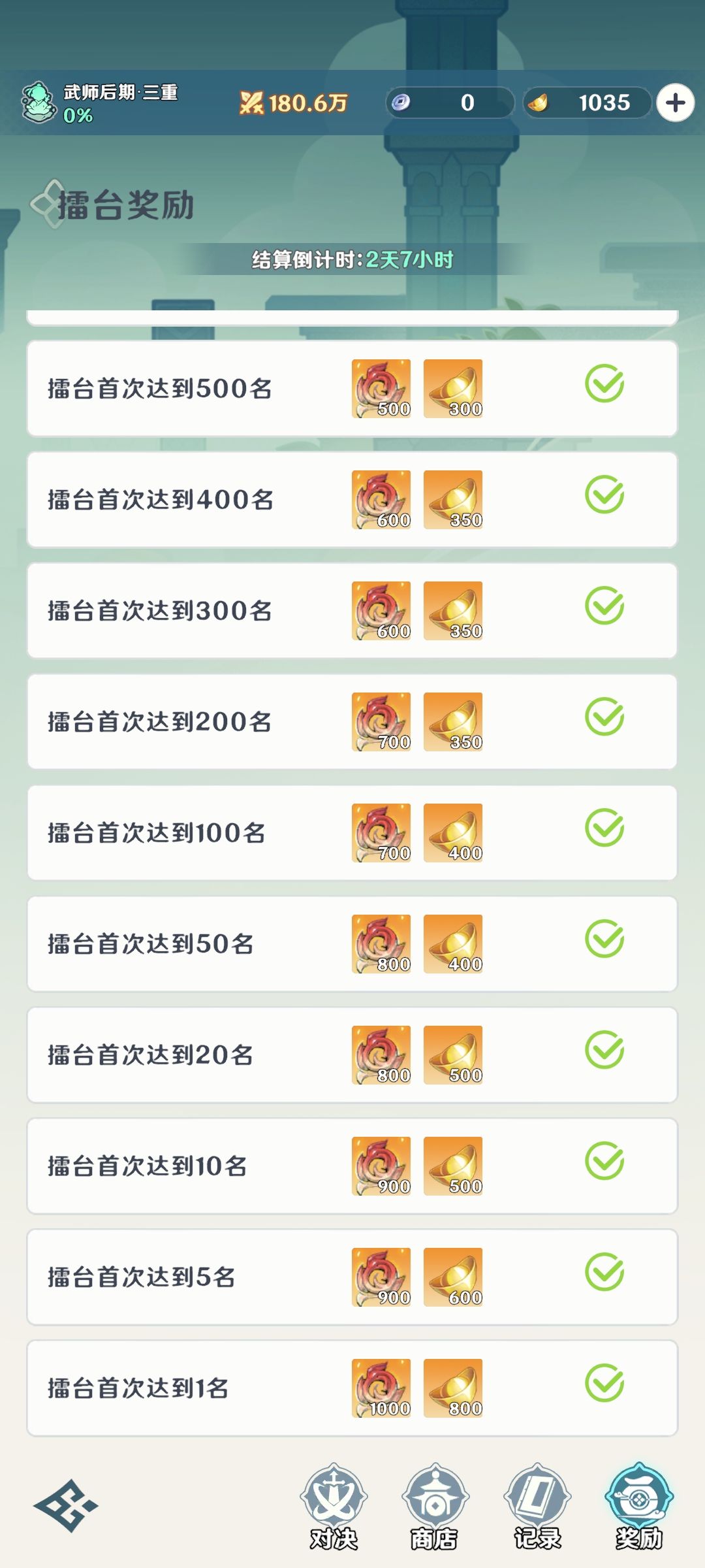 新手新手获得资源最重要的地方之一,可以获得大量的排行奖励以及元宝,排行奖励可以购买抽奖券和武学,这里的武学和武学经验要自己酌情考虑,如果自己运气不好的话,建议买经验,相信自己运气就买武学搏一搏,极武。(图3.4)萌新们开服之后就应该立马进入去抢这个擂台赛的排名,等到稍微有一点战力后,就不要管那些战力差的大或者要消耗元宝啊什么的,直接去拿下第一,第一给的奖励很多,我也是趁着开服去偷下了第一,拿到了第一的奖励。