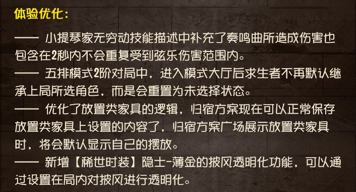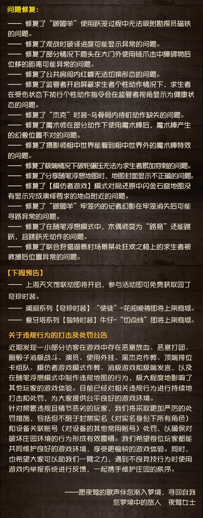 ——【版本福利】:活动期间登录游戏即可领取【第三十九赛季·精华1×10】;2025暑期充值返利活动开启;【记忆珍宝·旧赛季】中各个品质的指定机会重置。 ——【新赛季】:本周第三十九赛季·精华1正式开放,全新时装更新,包括隐士稀世时装-薄金、医生奇珍时装-银锑和守墓人奇珍时装-冥契;第三十九赛季·推理之径特殊格奖励为【头像】幸运儿-“未知射线”X、【头像框】幸运儿-“未知射线”X、【独特随身物品】幸运儿-透视和 【奇珍时装】幸运儿-“未知射线”X;第三十九赛季,每日完成三场排位赛即可在次日0点领取对应的排位珍宝,有机会获得【稀世随身物品】隐士-缚翼、【奇珍随身物品】“跛脚羊”-乐园和【奇珍随身物品】魔术师-喝彩; ——【推演积分获取调整】:本赛季开始,单场战斗获取的推理积分永久提升20%。后续赛季冲刺活动开放时也将进一步提升数值; ——【版本活动】:【幽隧中的“密约”】活动开启; ——【夏汐拾影】:“夏汐拾影”活动时间延长至2025年7月23日23点59分结束,活动结束后“暗海探秘”玩法将单独限时开放。 更多详情,请看长图了解~