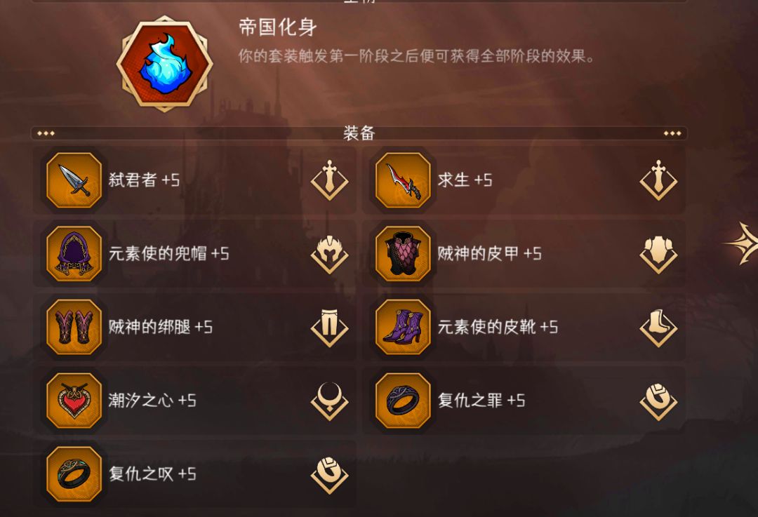 帝国圣物穿铁卫+元素,技能主要放火焰冲击减魔抗。我之前带图腾牧的时候把减cd戒指换了重甲戒指,带帝刺其实不需要吃伤害,所以无所谓,带减CD能多放个法术闪现也挺好的。