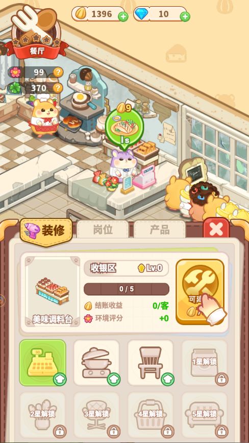 等安排好店铺的岗位之后,店铺就进入到了可运作的状态了,不过光是这样还不太够,因为此时的店铺还处于破破烂烂的状态,我们需要先装修一下店铺才能正式开始营业~