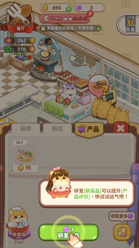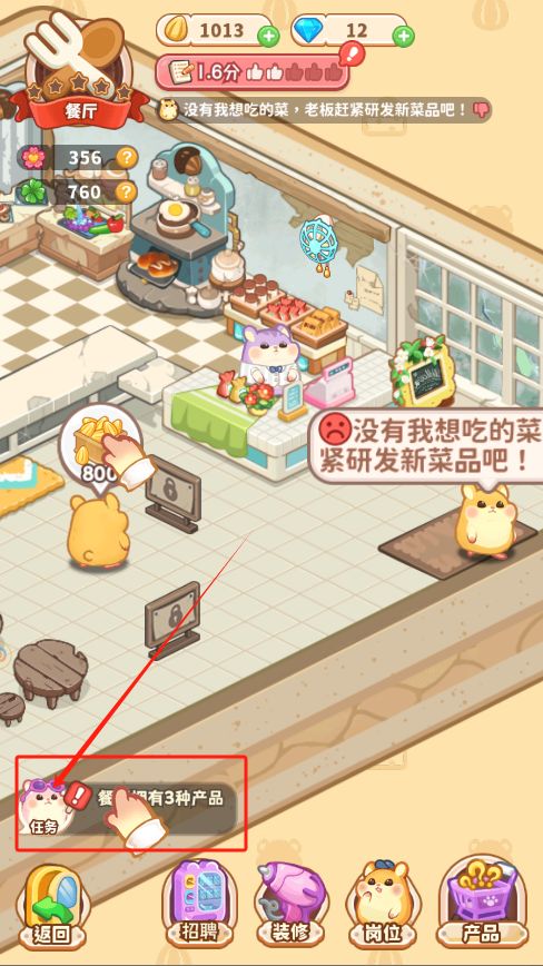 于是我们跟着新手剧情一直走,进入店铺点击右下方“岗位“按钮开始给店铺安排收银员以及研究员(厨师)