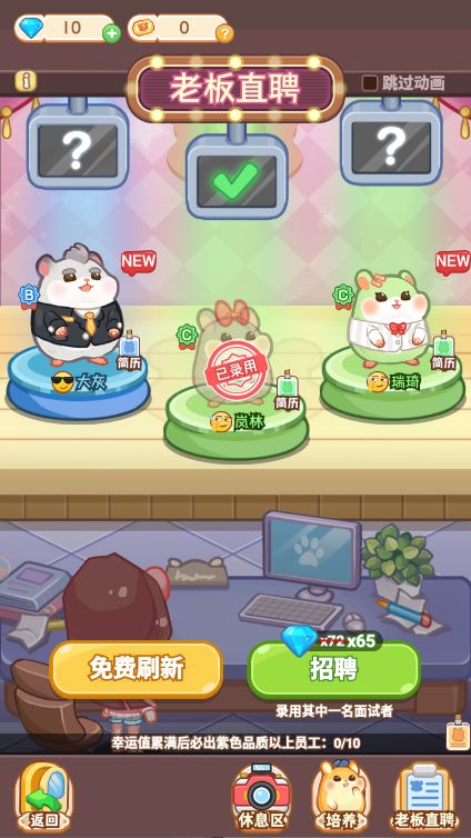 当然啦,在前期人手不足的情况,我们需要适当通过”老板直聘”来招一些鼠鼠充当我们的员工,当然了,前期的话能经营的店铺比较少,人力缺位不大,我们只需要使用免费的招募次数来招募员工就好了。