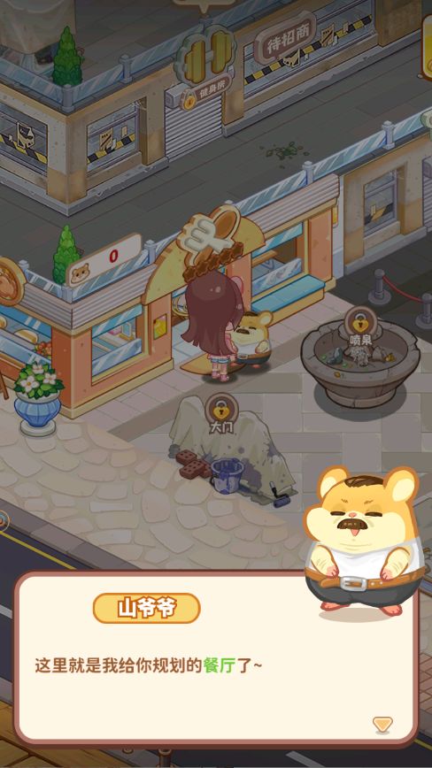 首先一进入游戏,山爷爷就会直接帮我们解锁第一家店铺:餐厅