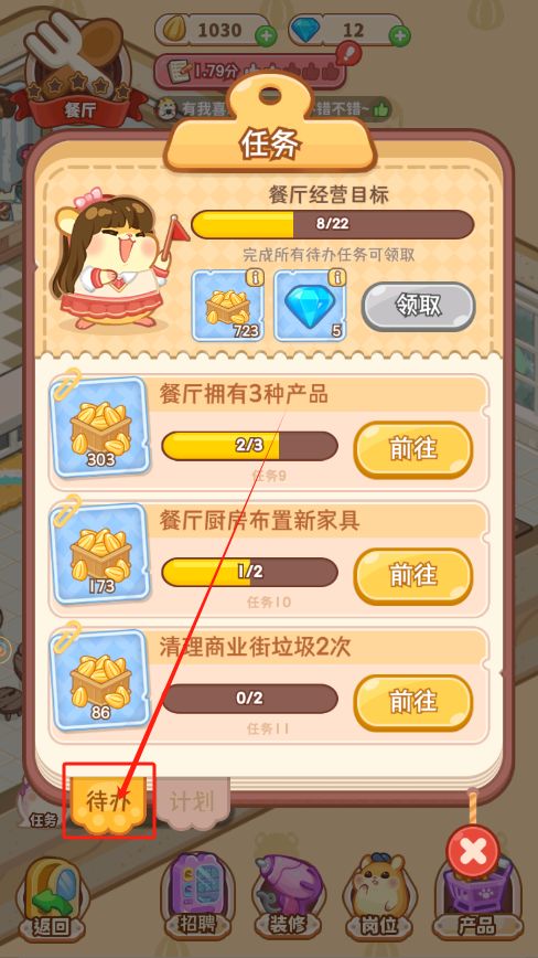 此外,这边也是建议各位店长可以参考游戏内的待办清单进行游玩经营,一般来说待办清单都是当前阶段店长们做了会对经营有所帮助的事情哦,点击页面左下角的“任务”按钮打开任务界面,再点击“待办”就能看到啦~