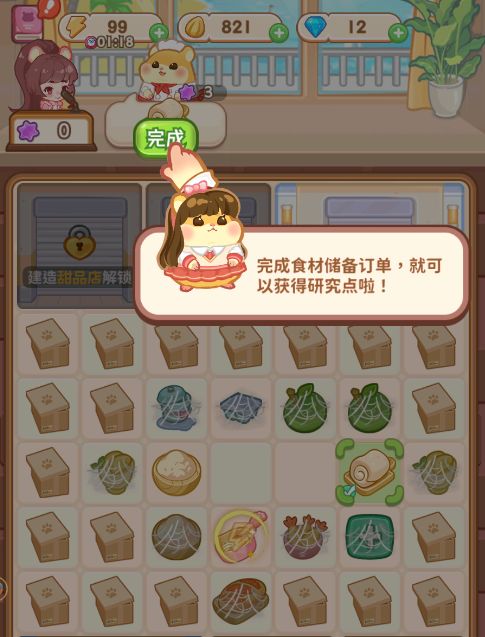 进入研究中心之后,完成合成小游戏:通过点击道具生成合成材料,将相同的合成材料拖动到一起即可合成更高一级的合成材料,提交对应的合成材料完成订单即可获得研究点。