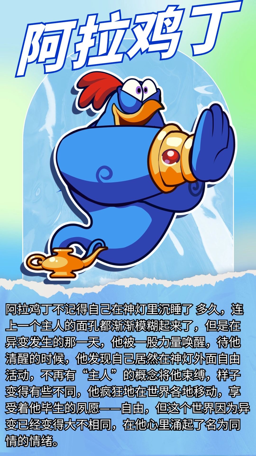 阿拉鸡丁在被唤醒后,发现自己置身于一个陌生的世界。天空中有着奇异的光芒,地面上生长着从未见过的植物。他意识到,这个世界因异变而充满了未知的危险